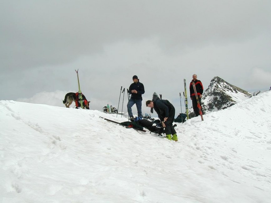 V úterý jsme vzhledem k počasí, které od rána slibovalo pouze déšť, nebyli příliš rozhodnuti, co budeme dělat, posléze, když slunce vylezlo, jsme se rozdělili na dvě skupiny. Jedna šla na lyžích do Smutného sedla, druhá pěšky k blízkým vodopádům v úpatí Baníkova. Detaily první skupiny neznám, vím jen, že Káča trhla Honzu Š. ve výstupu do sedla. Celá skupina se poté vrátila na chatu, my jsme s Karlem a Zdenou po lezecké vložce na skále, kde vodopády tečou, absolvovali krásný ale dlouhý výstup na Príslop Baníkova, odkud jsme po sousedním hřebeni seběhli zpět do doliny k chatě. Cestou jsme navštívili pomník těm, kdo v souboji s horou nevyhráli. Je tam nápis, který říká: Mrtvým na památku, živým pro výstrahu...