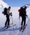 A tak tedy stoupáme – lyže na zádech, mačky na nohou a jdeme. Je to nekonečný, jak schody do nebe, občas se ohlédneme a vidíme tu nádheru kolem, vše pro změnu zalito sluncem. Ve vrchní části začíná přituhovat -v prudkém svahu se traverzuje a někdo před námi dost ošklivě padá, klouže se dolů, nic moc pohled… Naštěstí se zastavil, pak jsme se dozvěděli, že to odneslo koleno. Vytahujeme tedy cepíny a vše za pomoci šimonových rad zvládáme. Nahoře se těšíme alespoň na čokoládu, ale musíme rychle dolů, nějako se tam prohání mlha. Po sjezdu po Plateau Du Couloir, výstupu do sedla Sonadon 3504 m.n.m. a dlouhém sjezdu ledovcem Mont Durand dáváme jednu z mála pauz na oběd, chvilku stoupáme a pak pro změnu opět pěkný sjezd. Poté nasazujeme pásy a dupeme k chatě Chanrion 2462m.n.m.. Zde jsme se večer zvesela pomněli – dopřáli jsme si tři litry vína a pár piv, což vyvolalo trochu pozdvižení – zvykem je jít po večeři spát a ráno za kuropění být v pozoru. My jsme taky museli, ale tak nějak jsme většinou odcházeli mezi posledními a ráno pro změnu taky….
