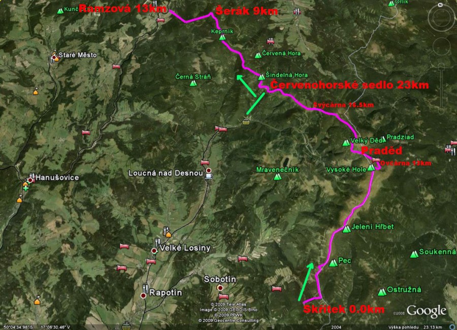 Akce bude na tri dny. Začínali bychom 26.2. v pátek na Skřítku /po nočním přejezdu vlakem a busem z Prahy/. Od tud vede trasa přes Pecný, Vysokou hůl, Ovčárnu, pod Praděd, k švýcárně a pak na Červenohorské sedlo kde přespíme. Další den /sobota/ projedeme místní sjezdový areál a přilehlé terény a stánky. V neděli ráno vyrazíme ostrým stoupáním na Červenou horu a přes Keprník dojdeme na šerák, pak nás čeká závěrečný dlouhý sjezd k nejvýše položené rychlíkové zastávce v ČR v Ramzové. Následovat bude noční přejezd vlakem domů.